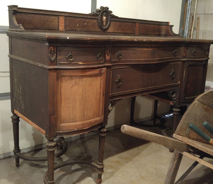 The wood veneer was buckled in a few places, there were a few cracks in the decorative braces between the legs, the wheels were rusted in place, one of the doors had the finish removed and was missing the hinges. Most of the decorative appliques were broken or missing and the entire buffet was full of stains, nicks and even splattered with bird poo!