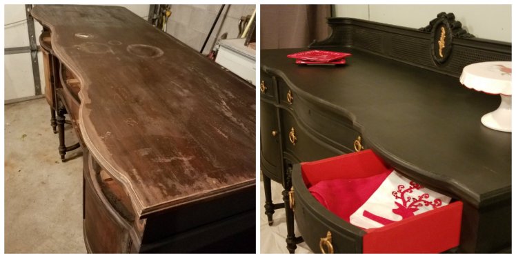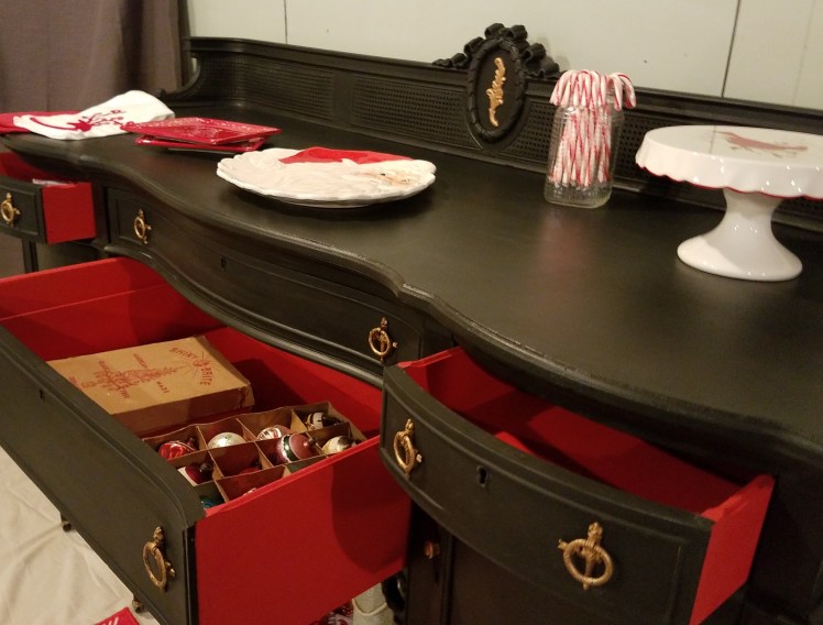 I cleaned the entire buffet thoroughly and lightly sanded the entire top and any spots that looked rough, then wiped the dust off with a damp rag. I thought a dark paint color would probably work best considering how dark the original finish was. I painted it with Dixie Belle Chalk Mineral Paint in Caviar. The insides of the drawers all got painted with Rustoleum Chalked Farmhouse Red and everything was sealed with Rustoleum Chalked Matte clear coat.