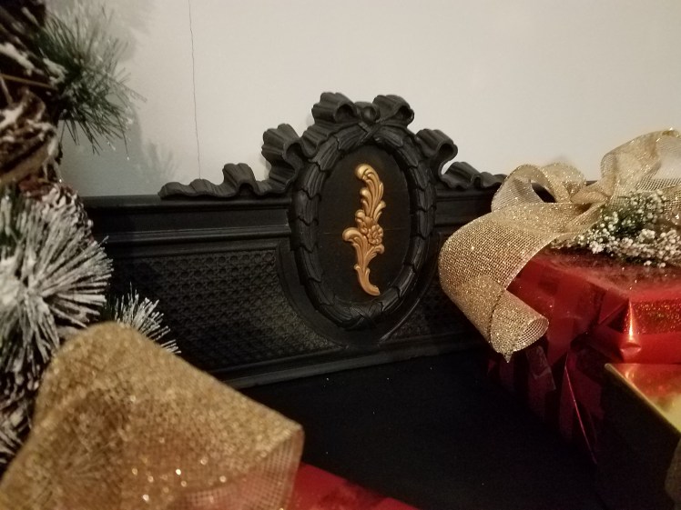 Since all of the wood appliques were broken I popped the remaining pieces off easily with a putty knife. The only one I wanted to replace was the one on the backsplash. The wood ribbon and wreath would have looked empty without something in the center. I found a wood applique at Hobby Lobby that fit perfectly! I painted it the same way I painted the drawer pulls.