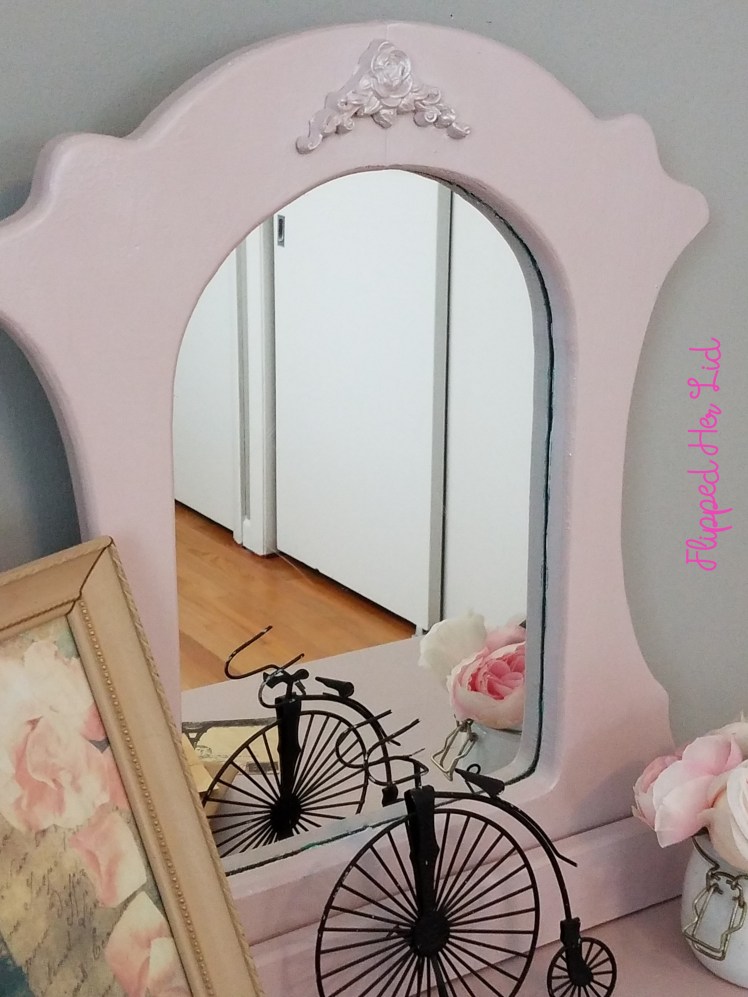I decided to go for a very feminine look with the pearl pink paint. In addition, I attached the little wooden floral applique on the top of the mirror. The mirror has a few minor scratches but is still in good shape otherwise. I used Rustoleum Chalked paint in Blush Pink and Matte sealer. Then I applied DecoArt Metallic Lustre in White Frost for a soft, sparkly sheen. I love the Rustoleum Chalked paint because it is about half the price of the other popular brands but is still high-quality paint. If you are working with a tight budget that really helps! I can buy it at my local Menards store or order it on Amazon.