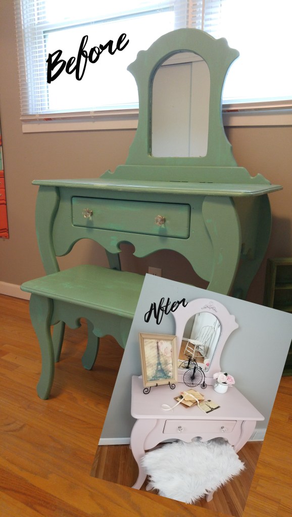 When the polar vortex descended upon us here in the Midwest my place of employment was closed for two days due to the extreme cold. Luckily I had furniture to work on to save me from getting cabin fever! I bought this unfinished pine vanity set back in the ’80s. I originally painted it hunter green which was popular at the time and I remember it being painted silver at some point. Unfortunately, I haven’t had room in my house for it so it has been in storage for years. It’s too cute to stay hidden away! I’m sure someone out there would love to have Gracie!