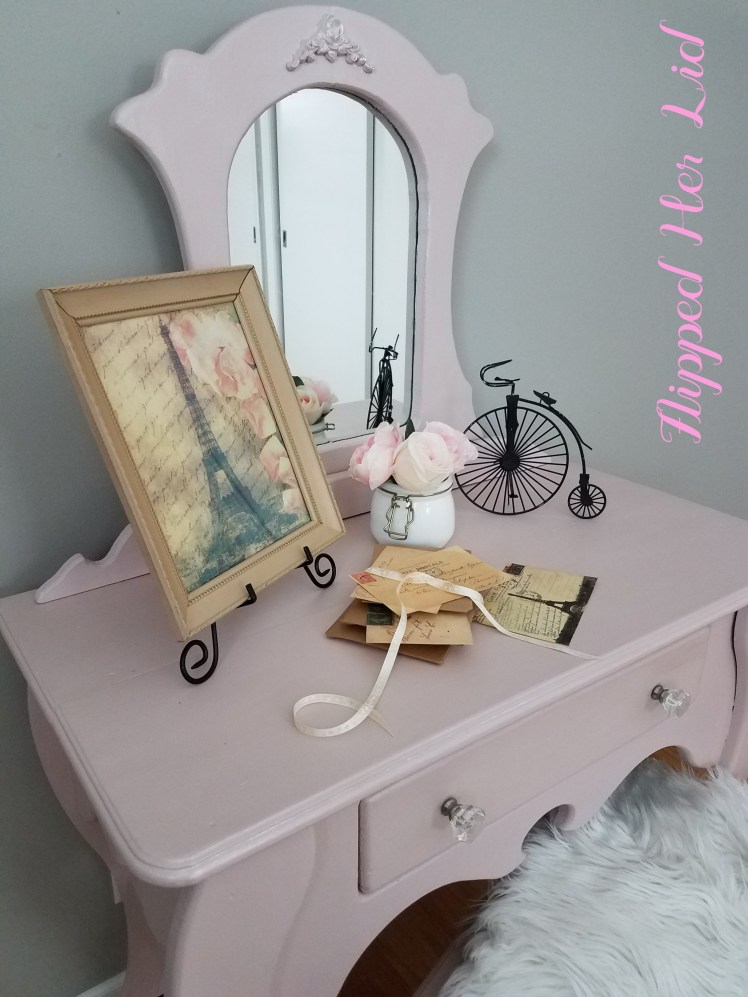 I staged the vanity with a free printable image of the Eiffel tower (link below) in an old vintage frame I had on hand. I found the printable French postcards on Pinterest. The fluffy, white seat cover is actually a rug I bought at T.J. Maxx and is not attached to the bench seat so it can be removed if desired.