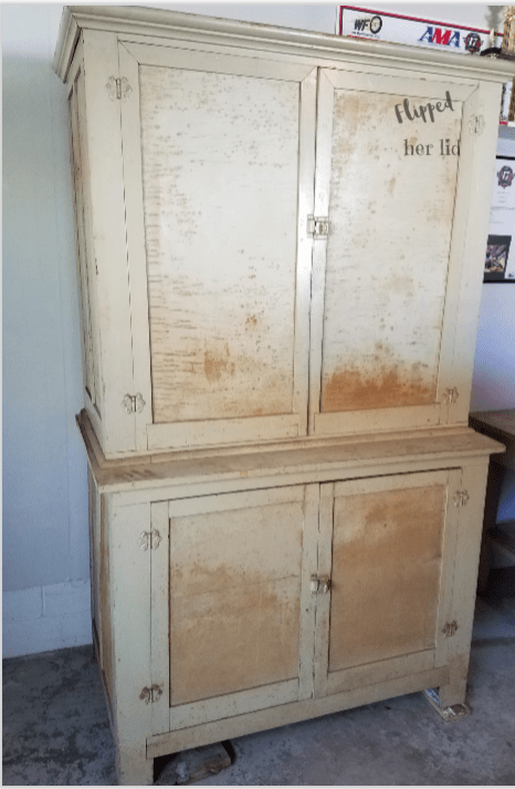 The exterior of the cupboard needed a good sanding and cleaning. I cut the panels out of the top two doors so I could replace them with chicken wire. I gave the entire exterior a grey wash using Rustoleum Country grey, thinned out with water. I wanted to try using real milk paint since I have never tried it before, the kind that comes as a powder and you mix it with water. I’ve heard that it will sometimes chip off in places giving the appearance of naturally aged paint. I used Miss Mustard Seed Milk Paint in Farmhouse White. The packet said it would make a quart of paint and should cover an average sized hutch. I mixed it according to the instructions on the package and was a little nervous because it didn’t look like a quart of paint. (not wild about the smell either 🤢). I was hoping it would chip off here and there allowing the Country Grey to show through. It didn’t chip on its own though, I had to “help” it with a paint scraper and sandpaper. I was happy with the end result but not sure I’m a big fan of milk paint in general. It was expensive and I barely had enough paint to get two coats on the exterior front and sides of the cupboard. By the time I got around to the last side on the second coat, I was adding water and crossing my fingers it would cover good enough that I wouldn’t have to order another package! After distressing the milk paint I lightly sanded the whole exterior to smooth out the rough feel of the milk paint. Every time I wiped down the dust from sanding with a damp rag the smell of rotten milk filled the air! After I finished distressing it, I sealed it with Rustoleum clear matte sealer so no worries about the odor anymore! I spray painted the chicken wire white before attaching it to the top doors of the cupboard.