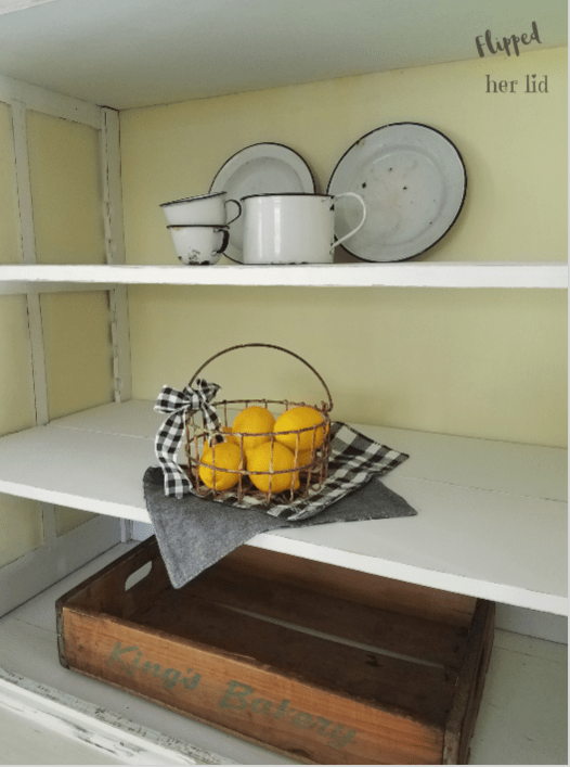 For the top section, I used a custom color for the back and side panels of the interior that was a mixture of White Satin with a splash of Home Decor Summer Porch blended in. Summer Porch is a bright sunny yellow and was a little too bright on its own but blended with the white satin it made a nice soft buttery yellow. I used the White Satin for the trim and shelves and lightly distressed.
