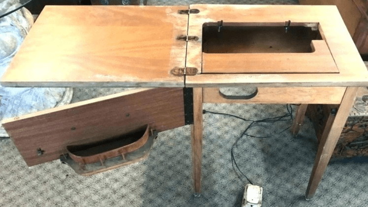 The lid served as a work area when sewing, the opening in the top is where a sewing machine used to be. My original plan was to find a tub to fill in the opening and turn Tailor into a cute little patio cooler that you could fill with ice and cold drinks, using the lid as a table to hold the glasses. I never found a tub to fit the opening and eventually, I decided to glue the lid closed and turn Tailor into a side table.