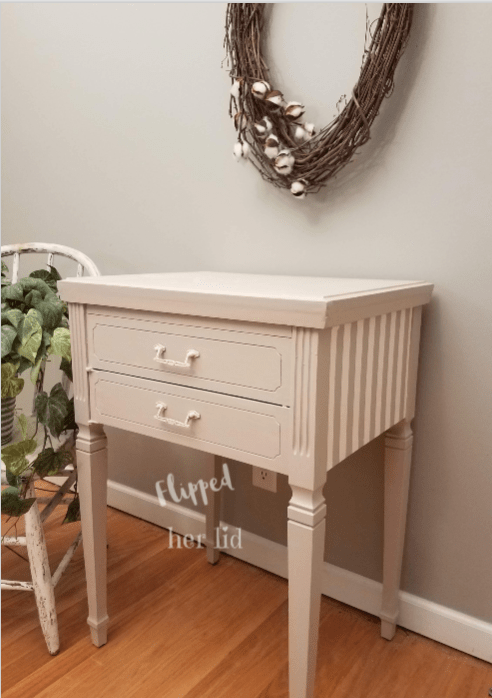 After gluing the lid down, I used spackle to fill in the gap between the lid and the top of the table, smoothing it with a putty knife. I applied a primer just to prevent any bleed through from the original stain and then two coats of Folk Art Home Decor French Linen. After that was dry I added some stripes to the sides in Folk Art H.D. Cottage White, using blue painters tape as a guide for the width of the stripes.