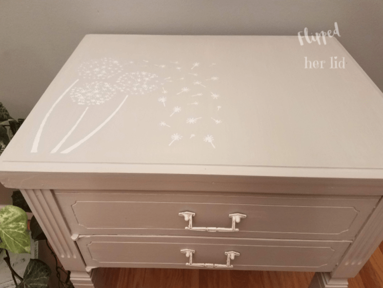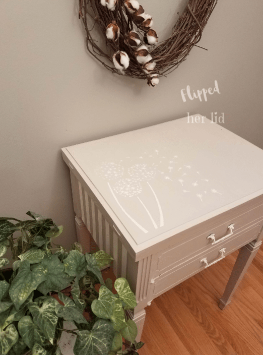 I used a dandelion stencil on the top and sealed the whole table in Rustoleum clear matte sealer.