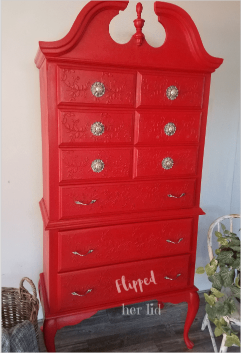 I just love the bold red color and the “glam” of the drawer knobs! I know the red probably won’t be an easy sell but I get so bored of painting everything in neutrals! I used Rustoleum Farmhouse Red and a coat of matte clear sealer. Then I used black wax to accent the stenciled details and create some shadow. The photos were taken in my garage where the lighting isn’t ideal so in some of the pics the dresser appears kind of tomato red but it really is a bright red like in the picture above.