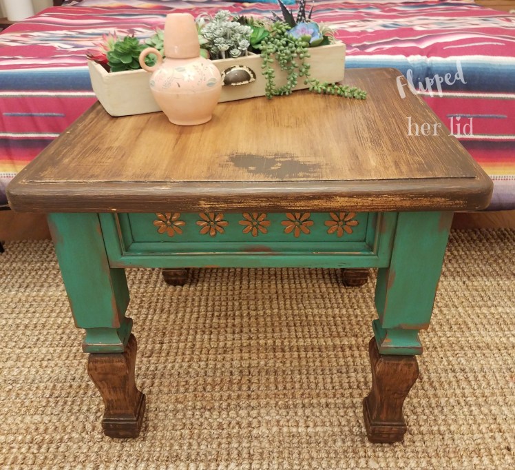 When that was dry, I used a dark wax by Waverly called Antique, brushed on and wiped off to age the paint from that bright turquoise to more of an aged teal. It really toned it down and gave it the perfect look to go with the distressed tabletop. I highlighted the raised floral design and some of the edges with Rustoleum metallic in Bronze Medal.