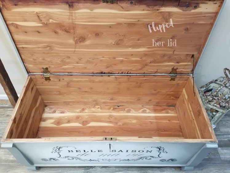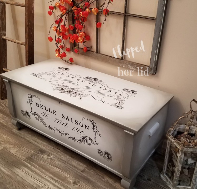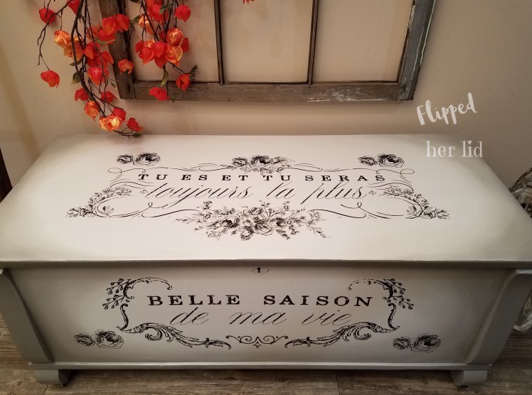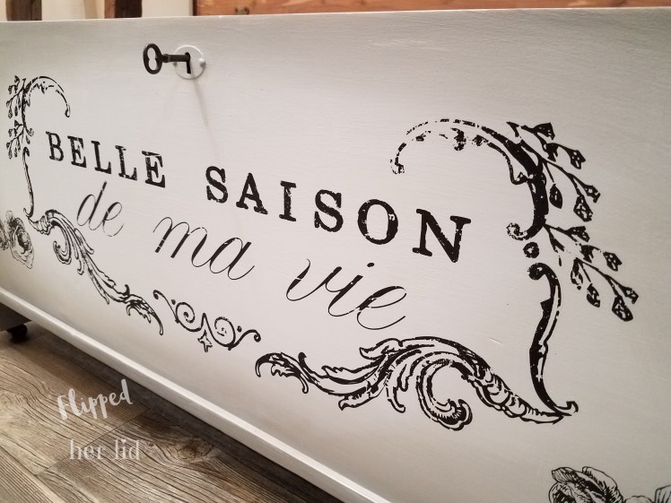 As I was working on this piece, I couldn’t help but wonder if Great Aunt Jessie would have approved of the new look? She loved traveling and I don’t know if she ever made it to France or not but something tells me she would have at least liked the verbiage. I do have some sentimental attachment to this chest so I’m still not sure if I can part with it or not but it definitely doesn’t fit in with my decor! It might have to just sit around until I get sick of it being in the way! I think it would look cute in a French-styled bedroom, sitting at the foot of the bed to hold extra blankets.