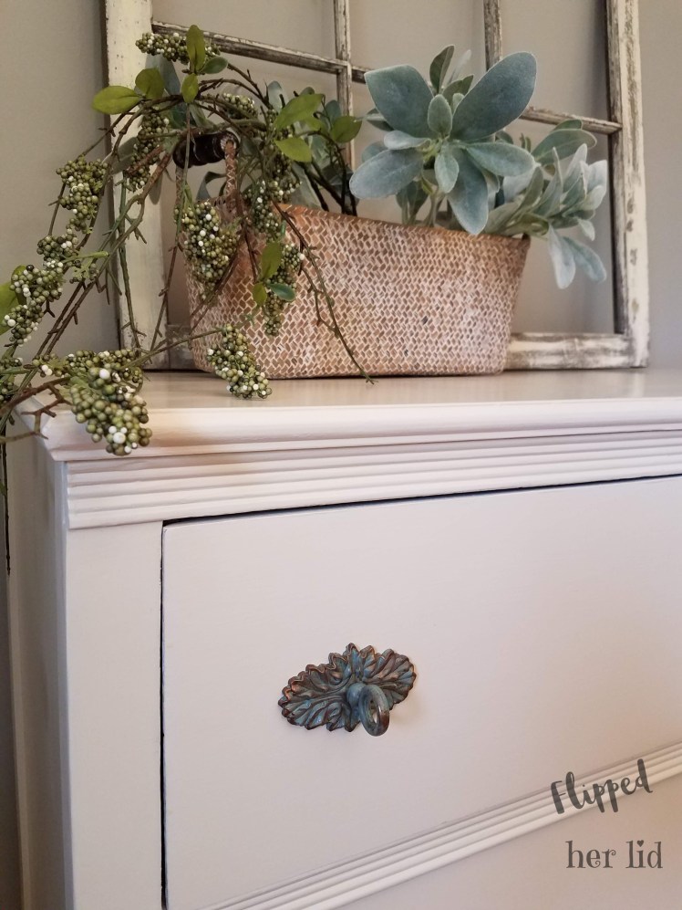 I applied two coats of Drop Cloth to the dresser, lightly sanding between coats. It looks gorgeous, I just love that Drop Cloth color! I top-coated with Polycrylic. I decided to use the WoodUbend lock appliques on this project too, so I painted them with metallic bronze and used dark wax to emphasize the details. I had six drawer knobs I had ordered from Hobby Lobby that had more of a green finish on them so I touched them up with some of the teal, used a little antiquing wax, and highlighted with the bronze.