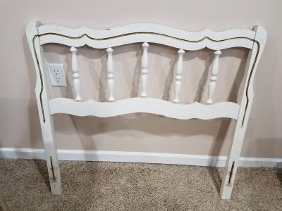 My neighbor asked me to paint this headboard for his granddaughter. His granddaughter’s bedroom walls are purple and she wanted the headboard to be white with purple dandelions. There wasn’t a lot of room to squeeze any dandelions on the top as it was, so the first thing I did was fill in the decorative groove with wood filler. I sanded the old glossy paint just to give it enough tooth for the primer to adhere. After the primer dried, I applied two coats of Rustoleum chalked in Linen White to the frame.