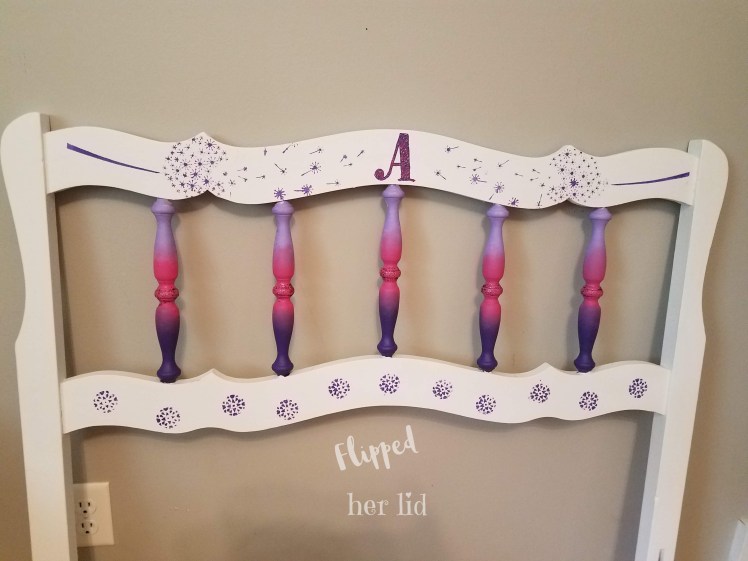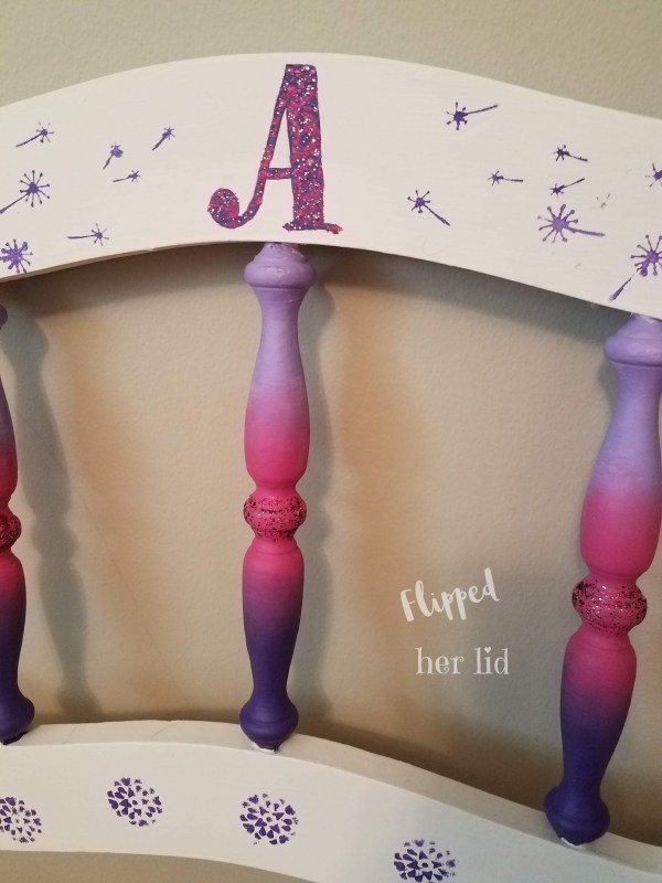I decided to jazz up the spindles with a pink and purple ombre look. I also stenciled her first initial in the center and added some glitter paint on that as well as the center section of the spindles for a little extra bling! Sure hope she likes it!