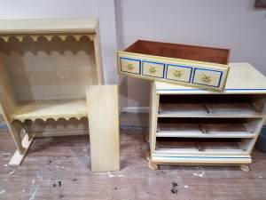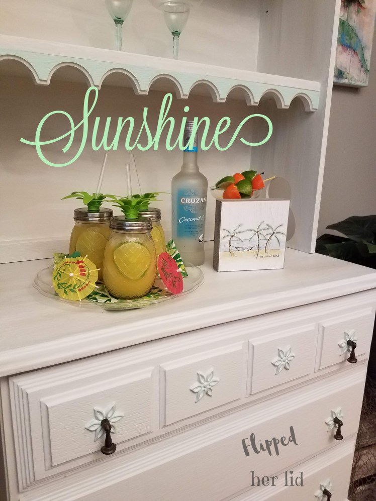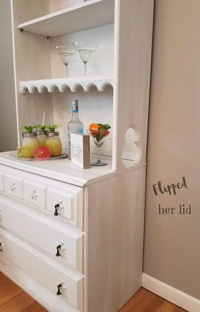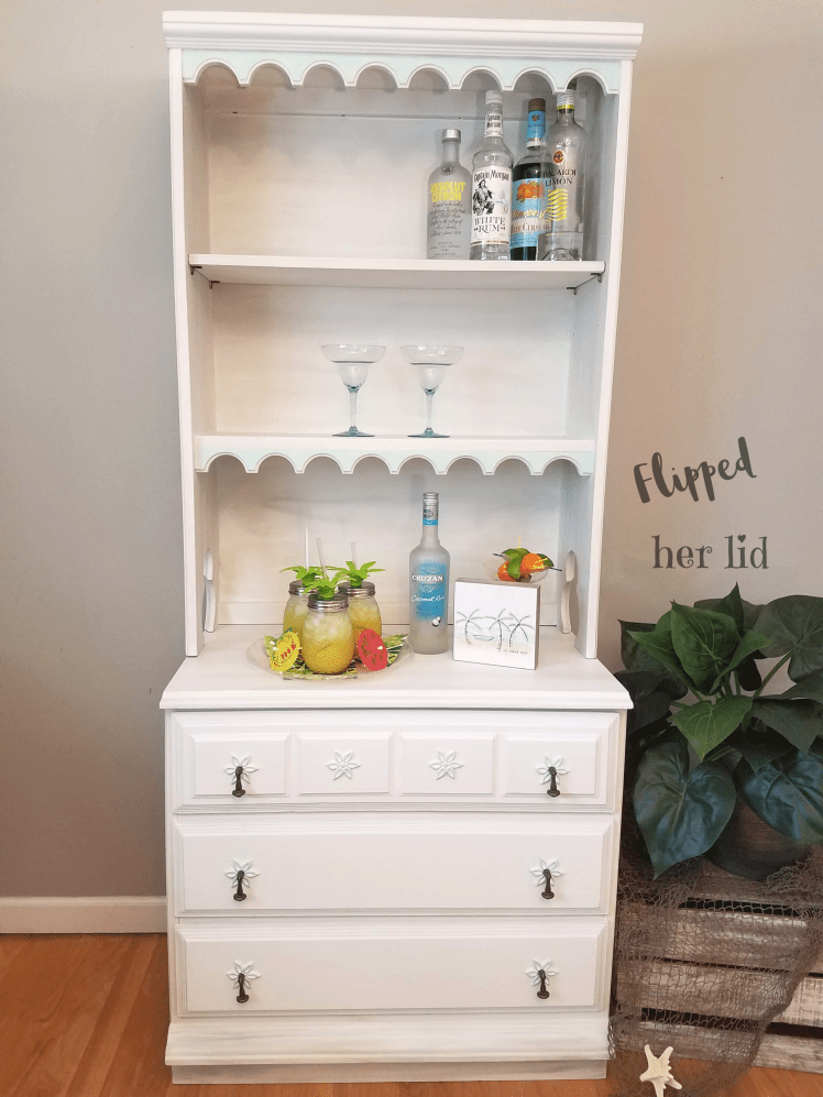 I staged Sunshine as a liquor storage hutch, but she would make a cute addition to any coastal decor and could be used as a dresser/bookshelf combo, a desk, or a dining room storage hutch.