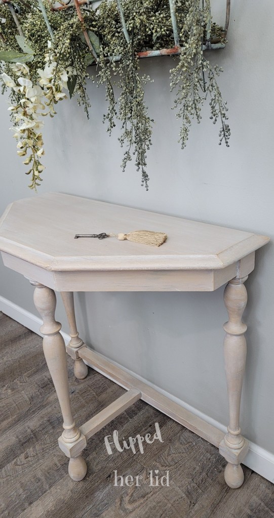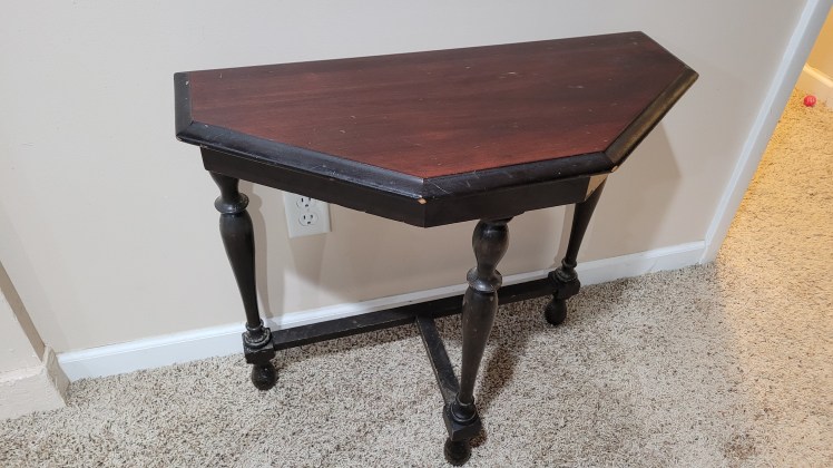 This cute little half table was another piece from a truckload of furniture I got a while back. I don’t know if this one is all that old but it is in really good shape other than a few chips on the front edge.