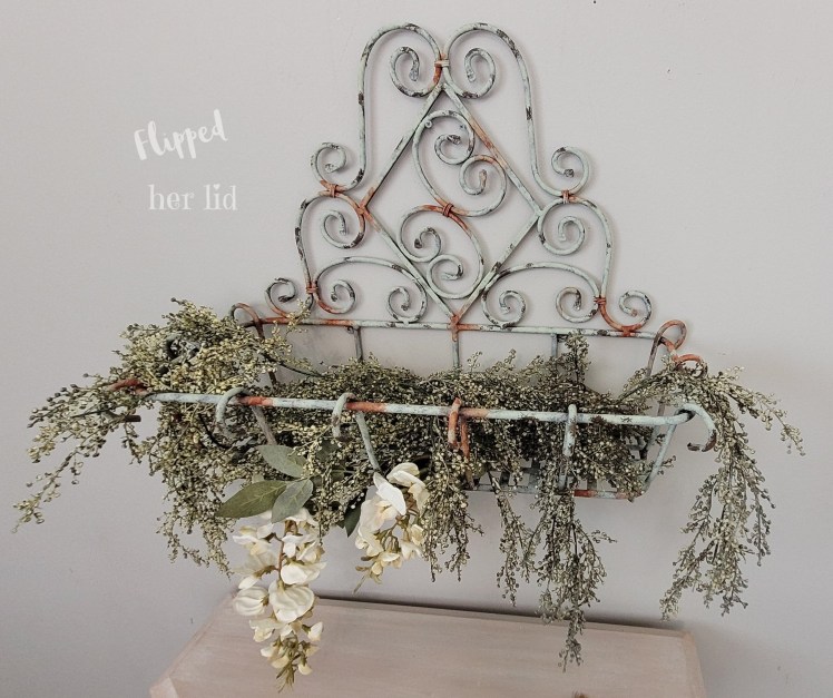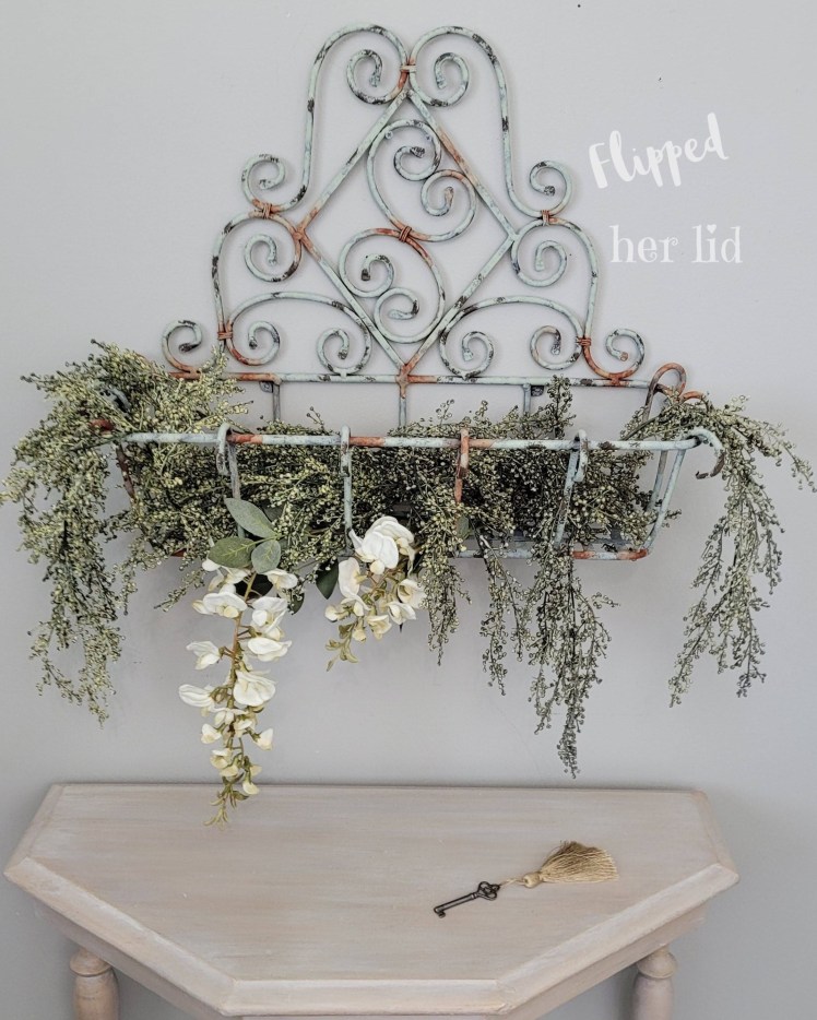 The wrought iron wall planter hanging above the table is one I found at our local Country Fair Mall. If you live locally and haven’t been there you should definitely go! They have a lot of vendors selling antiques, collectibles, and flea market items. I was actually hoping to find an antique wrought iron planter for my patio fence but I couldn’t seem to find exactly what I was looking for. This one is not an antique but when I saw that it was only $16 I decided I could just paint it to look old!